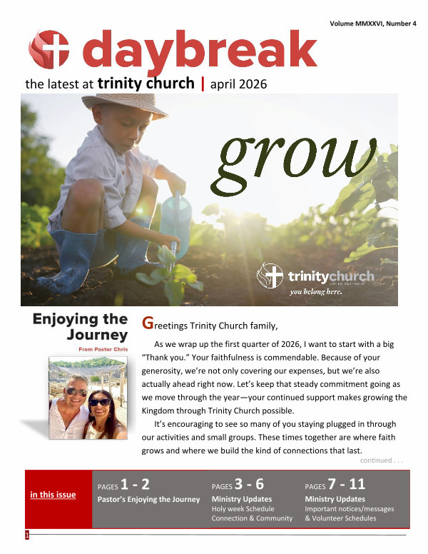 As we wrap up the first quarter of 2026, I want to start with a big“ Thank you.” Your faithfulness is commendable. Because of your generosity, we’ re not only covering our expenses, but we’ re also actually ahead right now. Let’ s keep that steady commitment going as we move through the year— your continued support makes growing the Kingdom through Trinity Church possible.