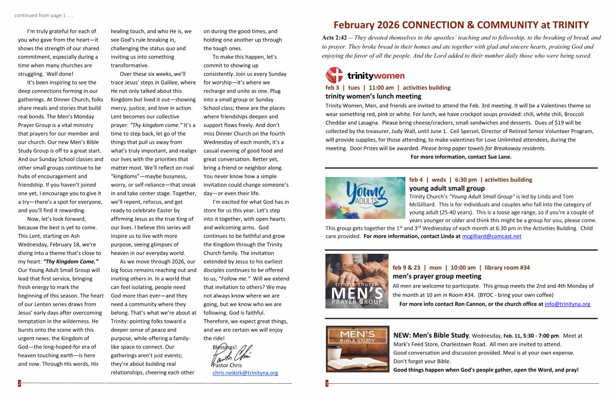 As we move through 2026, our big focus remains reaching out and inviting others in. In a world that can feel isolating, people need God more than ever— and they need a community where they belong. That’ s what we’ re about at Trinity: pointing folks toward a deeper sense of peace and purpose, while offering a familylike space to connect. Our gatherings aren’ t just events; they’ re about building real relationships, cheering each other on during the good times, and holding one another up through the tough ones.