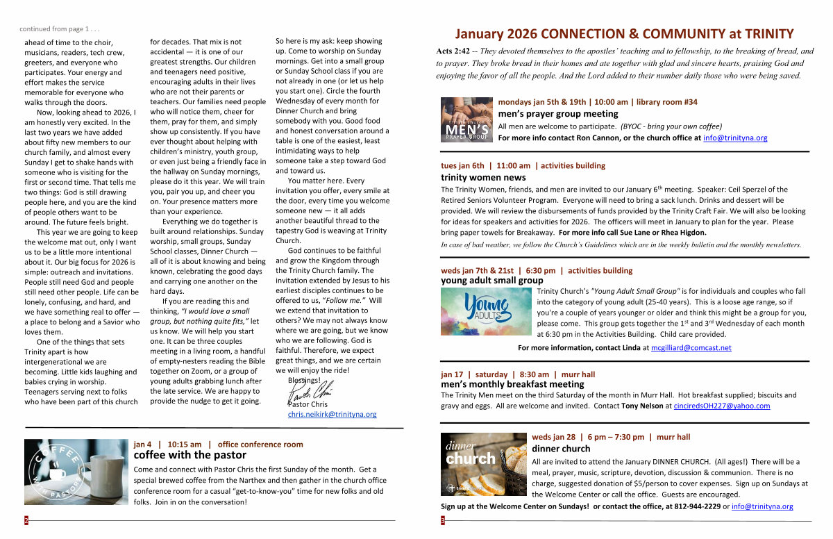 One of the things that sets Trinity apart is how intergenerational we are becoming. Little kids laughing and babies crying in worship. Teenagers serving next to folks who have been part of this church for decades. That mix is not accidental— it is one of our greatest strengths. Our children and teenagers need positive, encouraging adults in their lives who are not their parents or teachers. Our families need people who will notice them, cheer for them, pray for them, and simply show up consistently. If you have ever thought about helping with children’ s ministry, youth group, or even just being a friendly face in the hallway on Sunday mornings, please do it this year. We will train you, pair you up, and cheer you on. Your presence matters more than your experience.