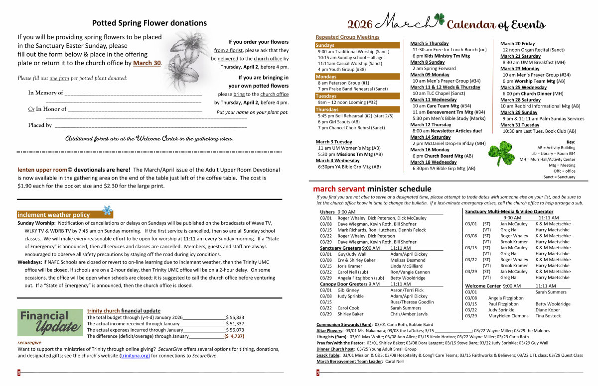 Communion Stewards( 9am): 03 / 01 Carla Roth, Bobbie Baird Altar Flowers: 03 / 01 Ms. Nakamara; 03 / 08 the LaDukes; 3 / 15 ________________; 03 / 22 Wayne Miller; 03 / 29 the Malones Liturgists( 9am): 03 / 01 Max White; 03 / 08 Ann Allen; 03 / 15 Kevin Horton; 03 / 22 Wayne Miller; 03 / 29 Carla Roth Pray for / with the Pastor: 03 / 01 Shirley Baker; 03 / 08 Dora Largent; 03 / 15 Steve Bare; 03 / 22 Judy Sprinkle; 03 / 29 Guy Wall Dinner Church host: 03 / 25 Young Adult Small Group Snack Table: 03 / 01 Mission & C & S; 03 / 08 Hospitality & Cong’ l Care Teams; 03 / 15 Faithworks & Believers; 03 / 22 UTL class; 03 / 29 Quest Class March Bereavement Team Leader: Carol Nell