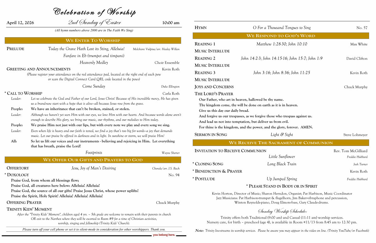 C e l e b r a t i o n o f W o r s h i p April 12, 2026 2nd Sunday of Easter 10:00 am( All hymn numbers above 2000 are in The Faith We Sing)