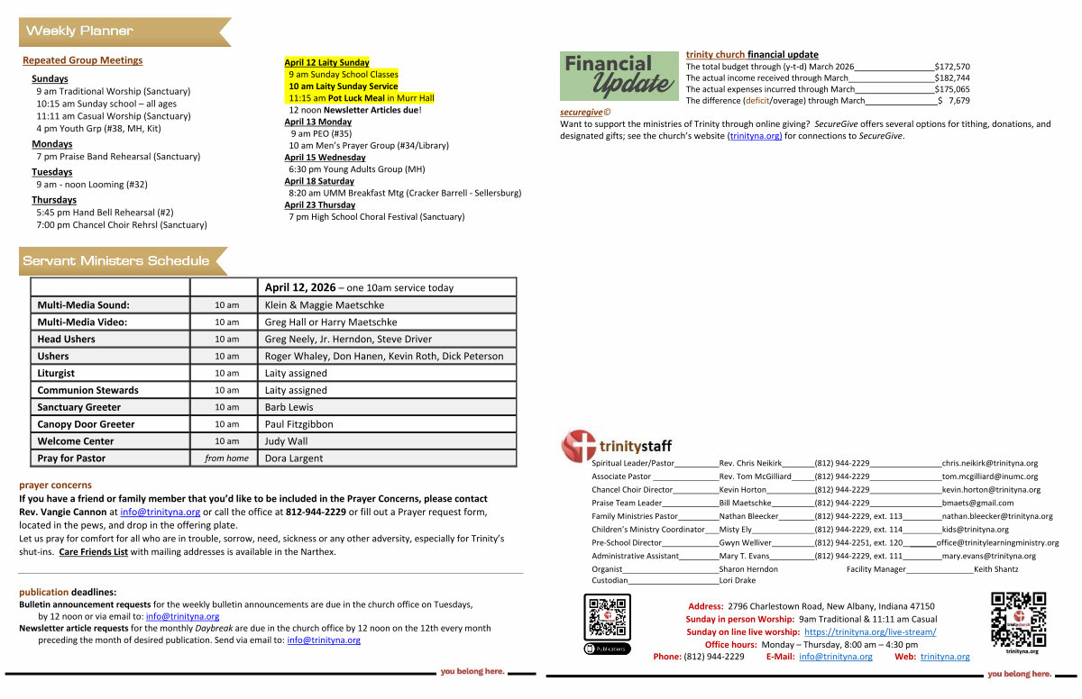April 12, 2026 – one 10am service today Multi-Media Sound: 10 am Klein & Maggie Maetschke Multi-Media Video: 10 am Greg Hall or Harry Maetschke Head Ushers 10 am Greg Neely, Jr. Herndon, Steve Driver Ushers 10 am Roger Whaley, Don Hanen, Kevin Roth, Dick Peterson Liturgist 10 am Laity assigned Communion Stewards 10 am Laity assigned