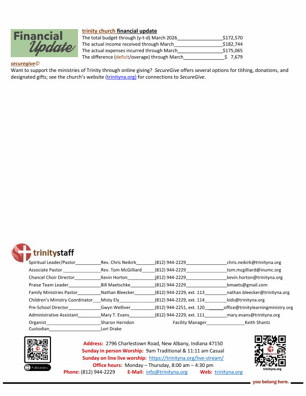 trinity church financial update The total budget through( y-t-d) March 2026 $ 172,570 The actual income received through March $ 182,744 The actual expenses incurred through March $ 175,065 The difference( deficit / overage) through March $ 7,679 securegive © Want to support the ministries of Trinity through online giving? SecureGive offers several options for tithing, donations, and designated gifts; see the church’ s website( trinityna. org) for connections to SecureGive.