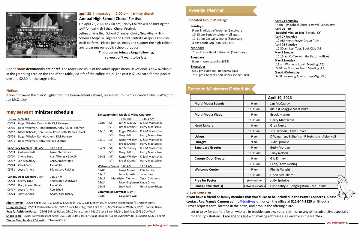 April 23 Thursday 7 pm High School Choral Festival( Sanctuary) April 26- 30 Redbird Mission Trip( Beverly, KY) April 27 Monday 10 AM Men’ s Prayer Group((# 34) April 28 Tuesday 10:30 am Last Tues. Book Club( AB) May 3 Sunday 10:15 am Coffee with the Pastor( office) May 5 Tuesday 11 am Women’ s Lunch Meeting( AB) 5:30 pm Missions Team Meeting( AB) May 6 Wednesday 6:30 pm Young Adult Group Mtg( MH)