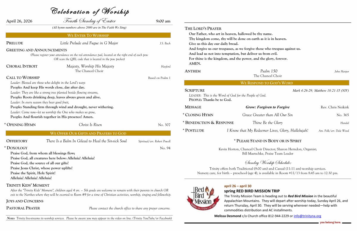MESSAGE Grow: Forgiven to Forgive Rev. Chris Neikirk * CLOSING HYMN Grace Greater than All Our Sin No. 365 * BENEDICTION & RESPONSE Thine Be the Glory Handel * POSTLUDE I Know that My Redeemer Lives, Glory, Hallelujah! Am. Folk / arr. Dale Wood