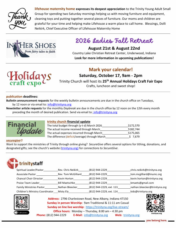 Mark your calendar! Saturday, October 17, 9am- 2pm Trinity Church will host its 25 th Annual Holidays Craft Fair Expo Crafts, luncheon and sweet shop! publication deadlines: Bulletin announcement requests for the weekly bulletin announcements are due in the church office on Tuesdays, by 12 noon or via email to: info @ trinityna. org Newsletter article requests for the monthly Daybreak are due in the church office by 12 noon on the 12th every month preceding the month of desired publication. Send via email to: info @ trinityna. org