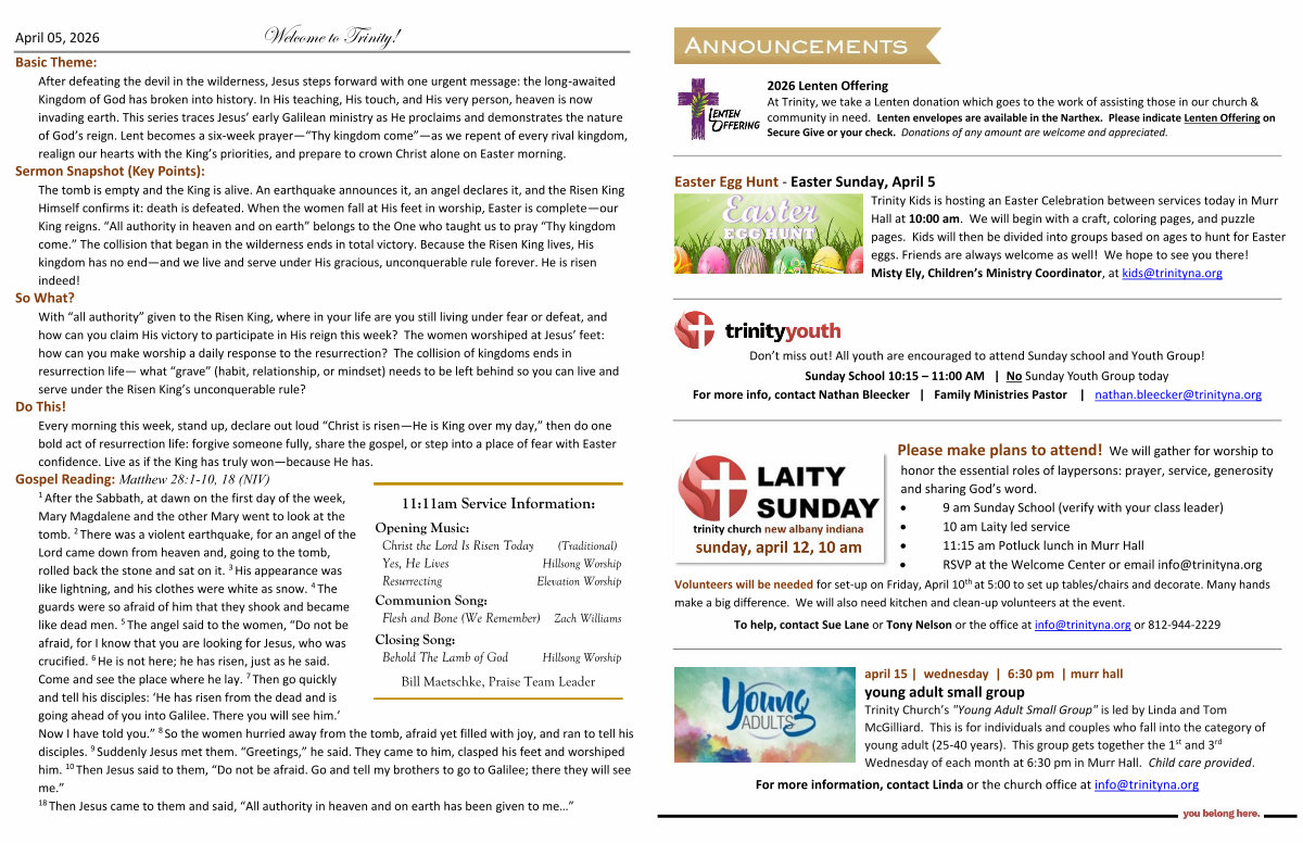 April 05, 2026 Welcome to Trinity! Basic Theme: