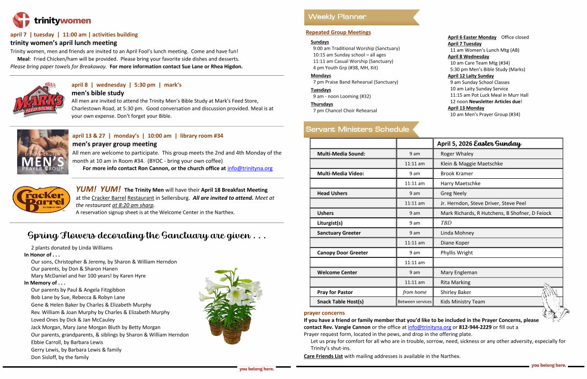 prayer concerns If you have a friend or family member that you’ d like to be included in the Prayer Concerns, please contact Rev. Vangie Cannon or the office at info @ trinityna. org or 812-944-2229 or fill out a Prayer request form, located in the pews, and drop in the offering plate. Let us pray for comfort for all who are in trouble, sorrow, need, sickness or any other adversity, especially for Trinity’ s shut-ins.