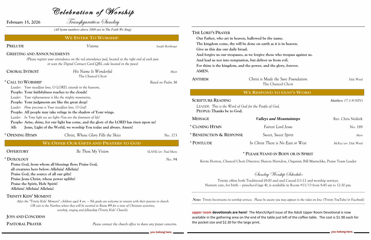 Note: Trinity live-streams its worship services. Please be aware you may appear in the video on line.( Trinity YouTube / or Facebook)