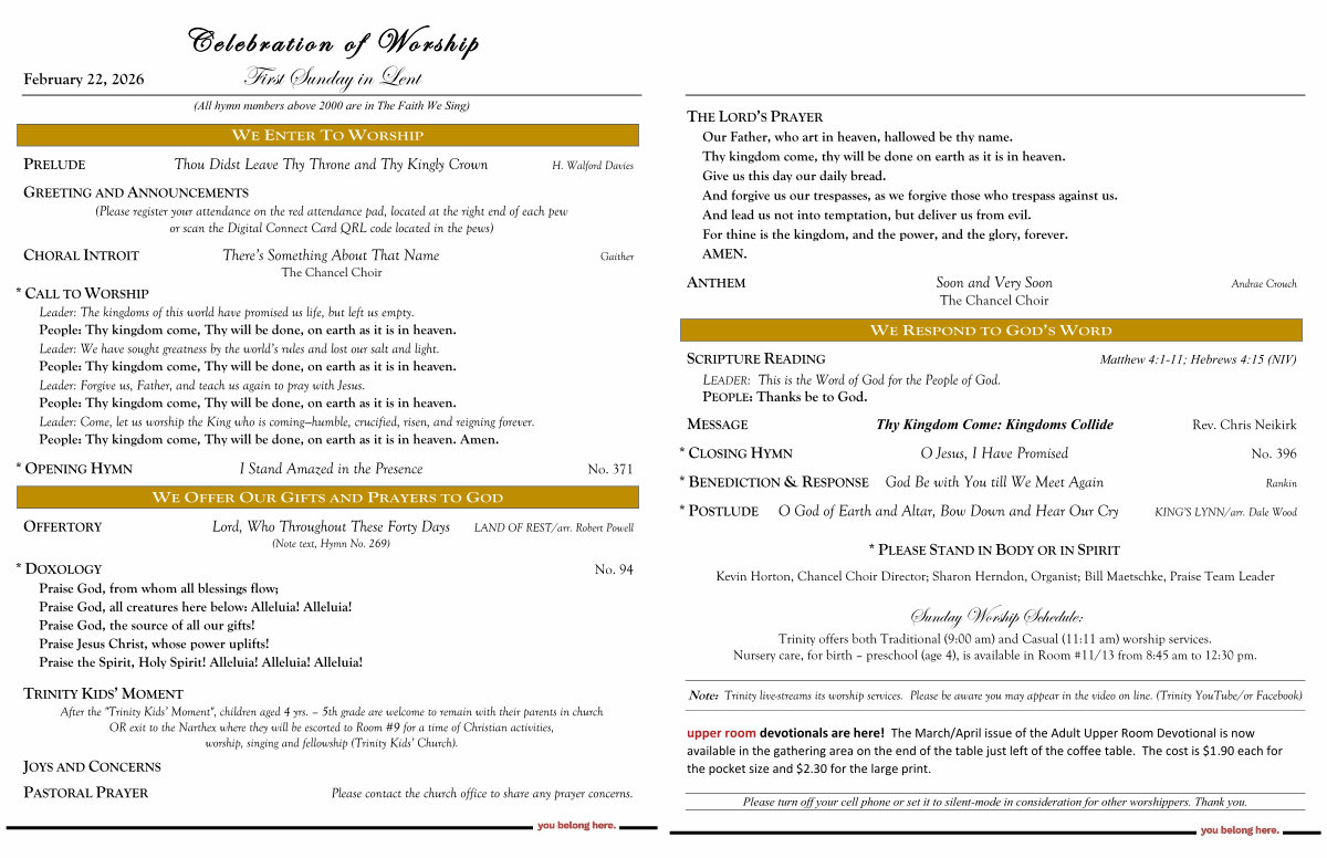 * CALL TO WORSHIP Leader: The kingdoms of this world have promised us life, but left us empty. People: Thy kingdom come, Thy will be done, on earth as it is in heaven. Leader: We have sought greatness by the world’ s rules and lost our salt and light. People: Thy kingdom come, Thy will be done, on earth as it is in heaven. Leader: Forgive us, Father, and teach us again to pray with Jesus. People: Thy kingdom come, Thy will be done, on earth as it is in heaven. Leader: Come, let us worship the King who is coming— humble, crucified, risen, and reigning forever. People: Thy kingdom come, Thy will be done, on earth as it is in heaven. Amen.