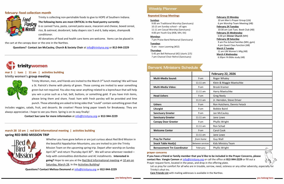 prayer concerns If you have a friend or family member that you’ d like to be included in the Prayer Concerns, please contact Rev. Vangie Cannon at info @ trinityna. org or call the office at 812-944-2229 or fill out a Prayer request form, located in the pews, and drop in the offering plate. Let us pray for comfort for all who are in trouble, sorrow, need, sickness or any other adversity, especially for Trinity’ s shut-ins. Care Friends List with mailing addresses is available in the Narthex.