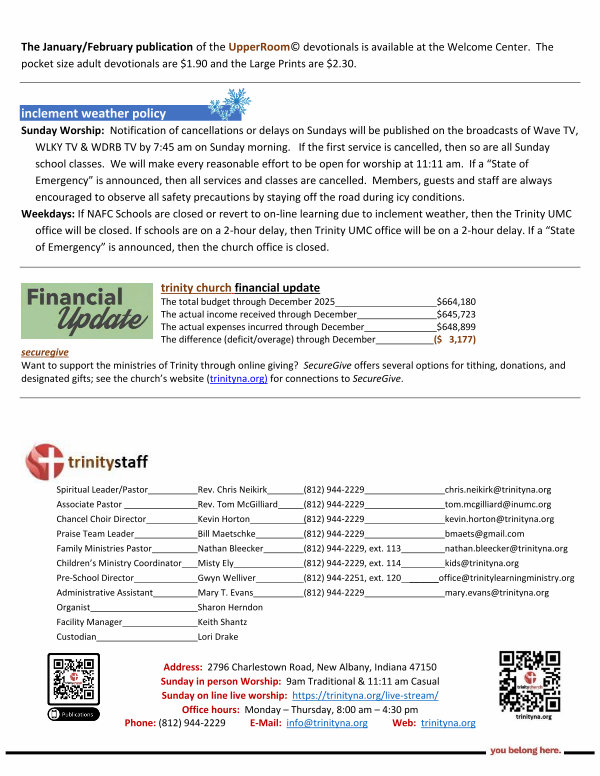 Weekdays: If NAFC Schools are closed or revert to on-line learning due to inclement weather, then the Trinity UMC office will be closed. If schools are on a 2-hour delay, then Trinity UMC office will be on a 2-hour delay. If a“ State of Emergency” is announced, then the church office is closed.