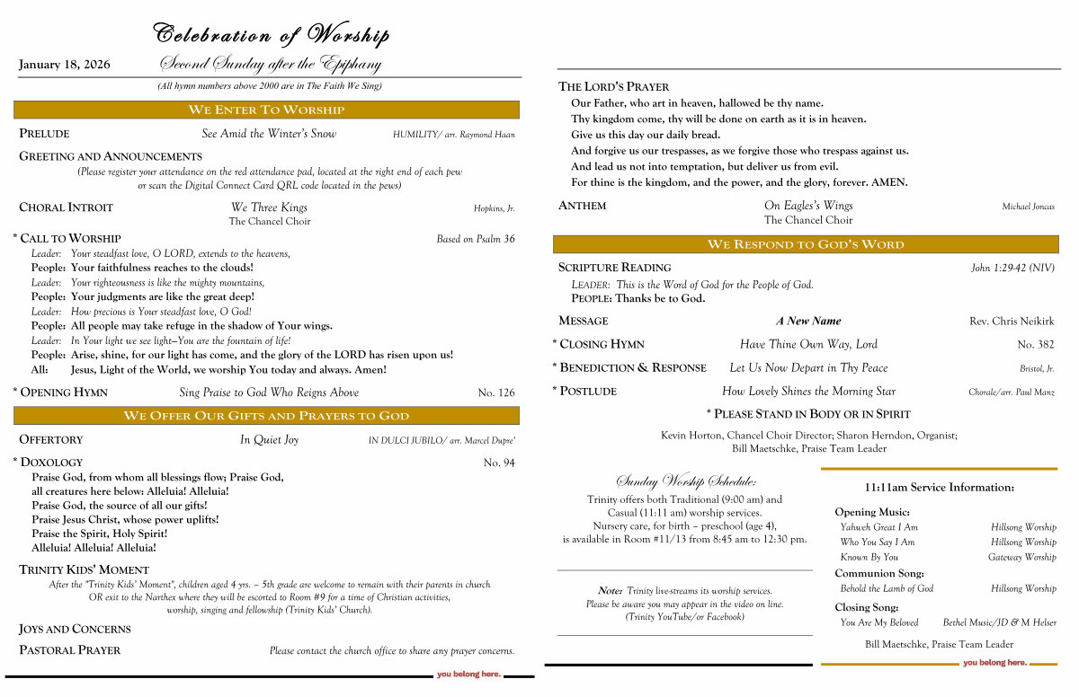 Note: Trinity live-streams its worship services. Please be aware you may appear in the video on line.( Trinity YouTube / or Facebook)