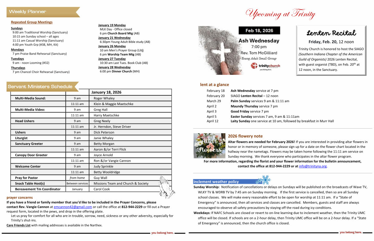 Weekdays: If NAFC Schools are closed or revert to on-line learning due to inclement weather, then the Trinity UMC office will be closed. If schools are on a 2-hour delay, then Trinity UMC office will be on a 2-hour delay. If a“ State of Emergency” is announced, then the church office is closed.