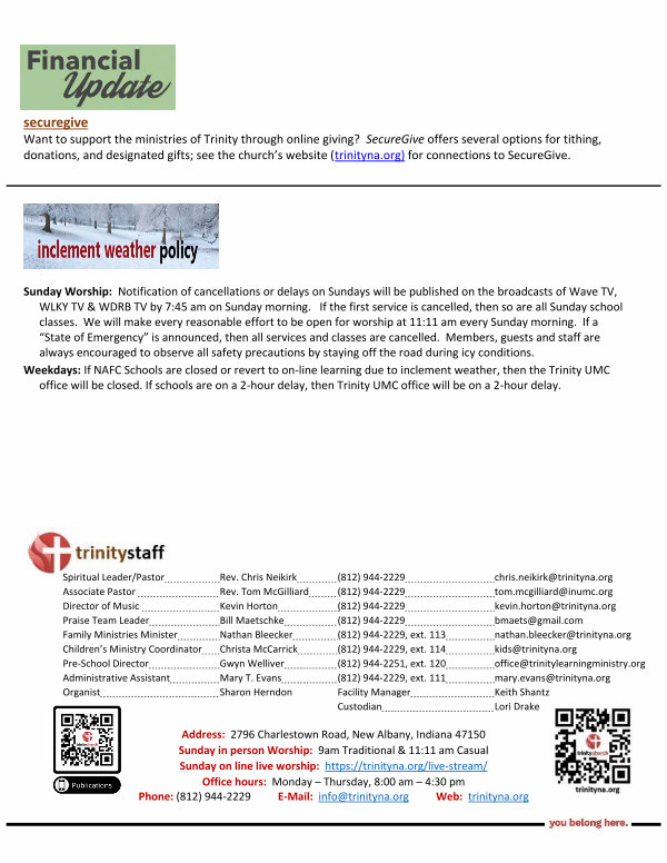 Weekdays: If NAFC Schools are closed or revert to on-line learning due to inclement weather, then the Trinity UMC office will be closed. If schools are on a 2-hour delay, then Trinity UMC office will be on a 2-hour delay.