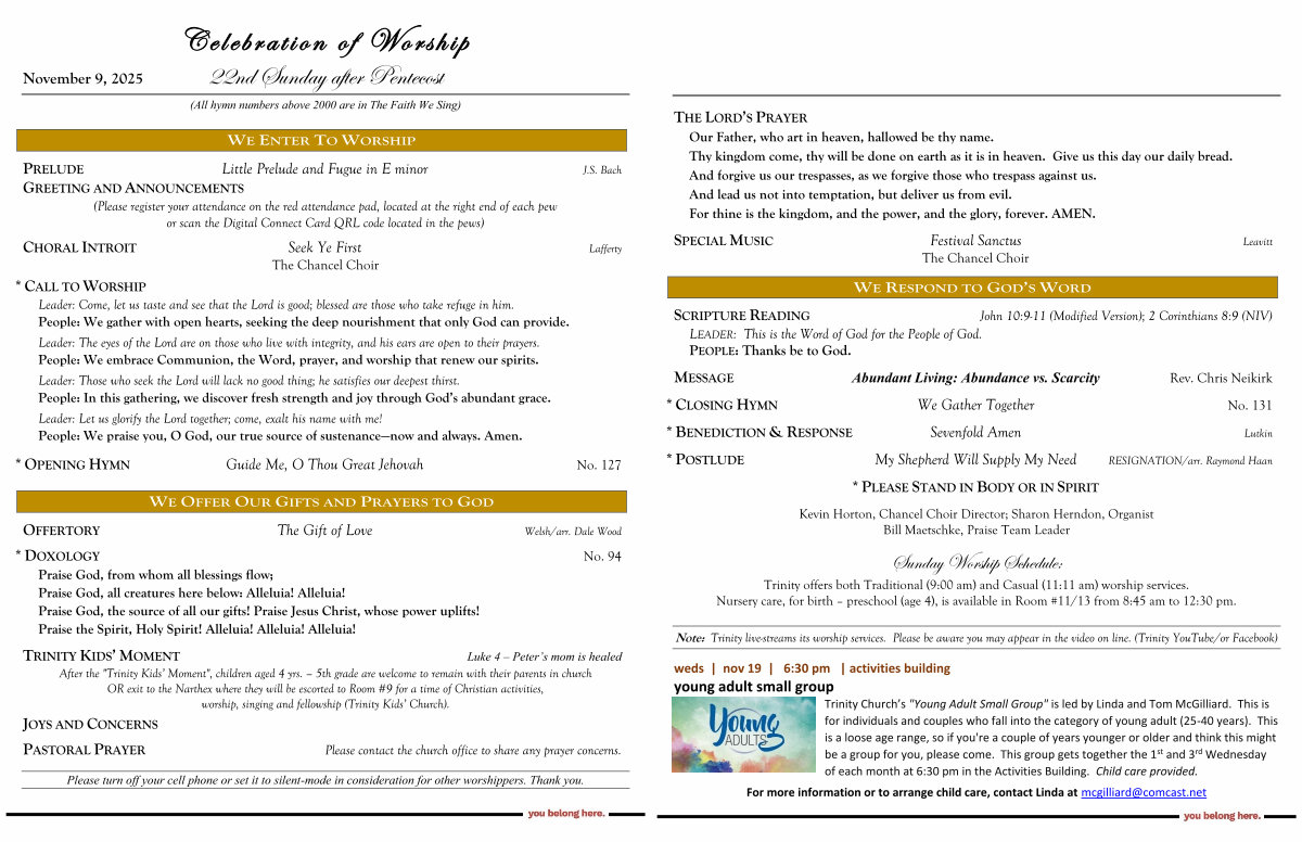 Note: Trinity live-streams its worship services. Please be aware you may appear in the video on line.( Trinity YouTube / or Facebook)