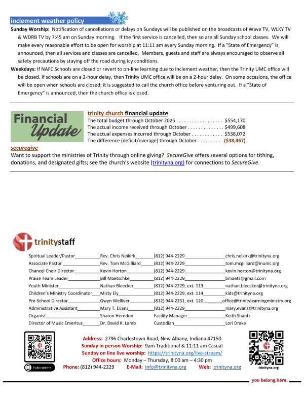 The total budget through October 2025.................. $ 554,170 The actual income received through October.............. $ 499,608 The actual expenses incurred through October............ $ 538,072 The difference( deficit / overage) through October..........($ 38,467) securegive Want to support the ministries of Trinity through online giving? SecureGive offers several options for tithing, donations, and designated gifts; see the church’ s website( trinityna. org) for connections to SecureGive.