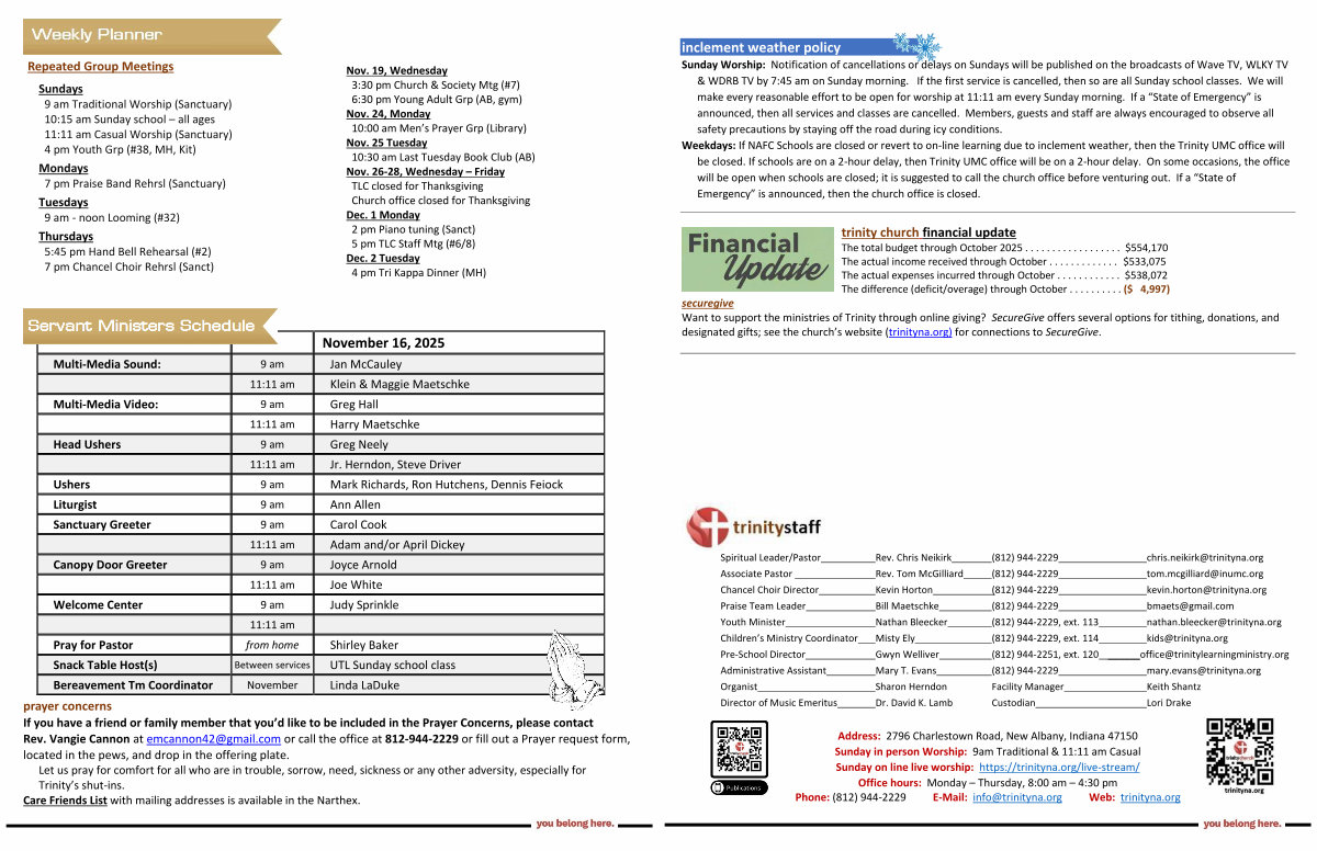 prayer concerns If you have a friend or family member that you’ d like to be included in the Prayer Concerns, please contact Rev. Vangie Cannon at emcannon42 @ gmail. com or call the office at 812-944-2229 or fill out a Prayer request form, located in the pews, and drop in the offering plate. Let us pray for comfort for all who are in trouble, sorrow, need, sickness or any other adversity, especially for Trinity’ s shut-ins.