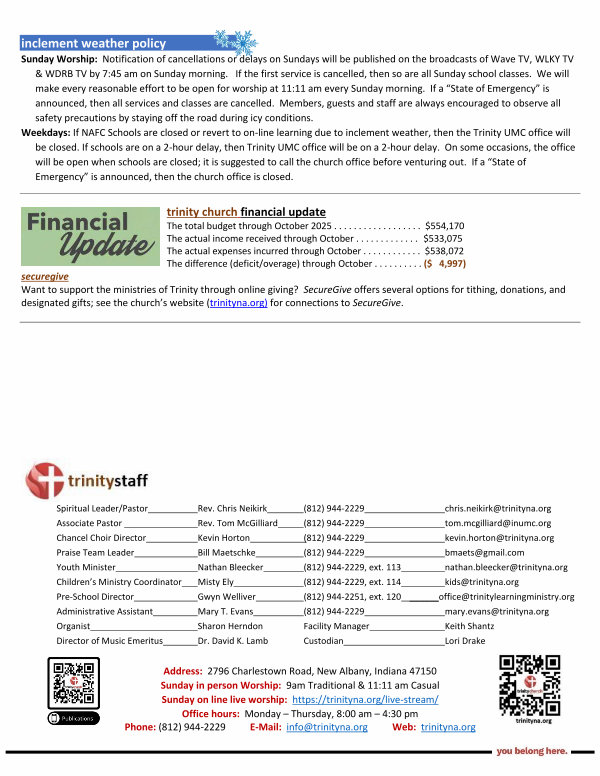 The total budget through October 2025.................. $ 554,170 The actual income received through October............. $ 533,075 The actual expenses incurred through October............ $ 538,072 The difference( deficit / overage) through October..........($ 4,997) securegive Want to support the ministries of Trinity through online giving? SecureGive offers several options for tithing, donations, and designated gifts; see the church’ s website( trinityna. org) for connections to SecureGive.