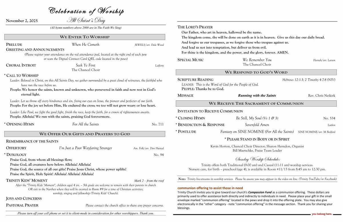 Leader: Beloved in Christ, on this All Saints Day, we gather surrounded by a great cloud of witnesses, the faithful who |
