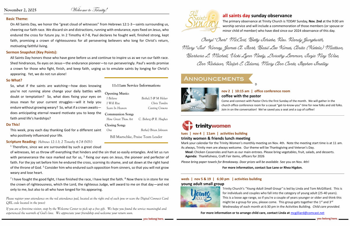 The primary observance at Trinity Church is TODAY Sunday, Nov. 2nd at the 9:00 am worship service and will include a commemoration of those members( or spouse or minor child of member) who have died since our 2024 observance of this day.