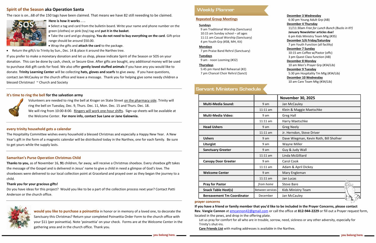 December 3 Wednesday 6:30 pm Young Adult Grp( AB) December 4 Thursday 11 / 11:30am Free for Lunch Bunch( Bucks in KY) January Newsletter articles due! 6 pm Kids Ministry Team Mtg(# 35) December 5 / 6 Friday / Saturday 7 pm Youth Function( all facility) December 7 Sunday 10:15 am Coffee w / Pastor( offc) 3 pm Quest Class function( AB) December 8 Monday 10 am Men’ s Prayer Grp(# 34 / Lib) December 9 Tuesday 5:30 pm Hospitality Tm Mtg(# 34 / Lib) December 10 Wednesday 10 am Care Team Mtg(# 34 / Lib)