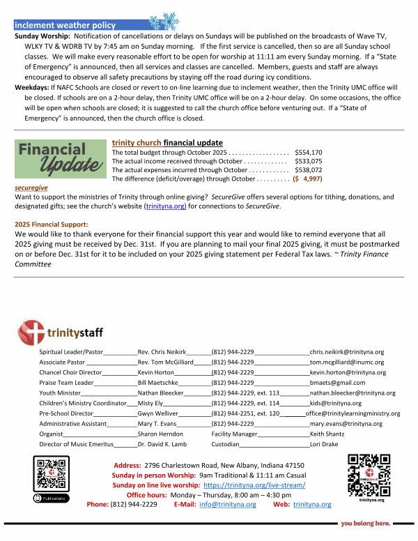 2025 Financial Support: We would like to thank everyone for their financial support this year and would like to remind everyone that all 2025 giving must be received by Dec. 31st. If you are planning to mail your final 2025 giving, it must be postmarked on or before Dec. 31st for it to be included on your 2025 giving statement per Federal Tax laws. ~ Trinity Finance Committee