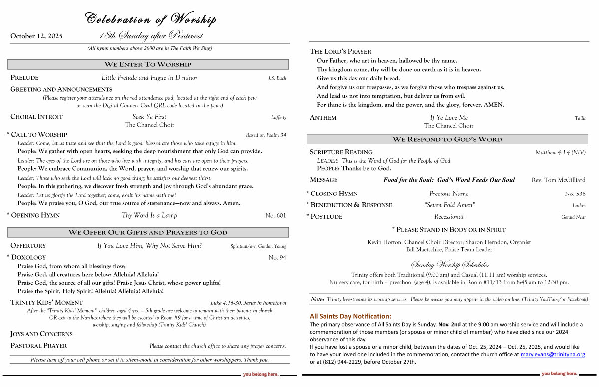 Note: Trinity live-streams its worship services. Please be aware you may appear in the video on line.( Trinity YouTube / or Facebook)