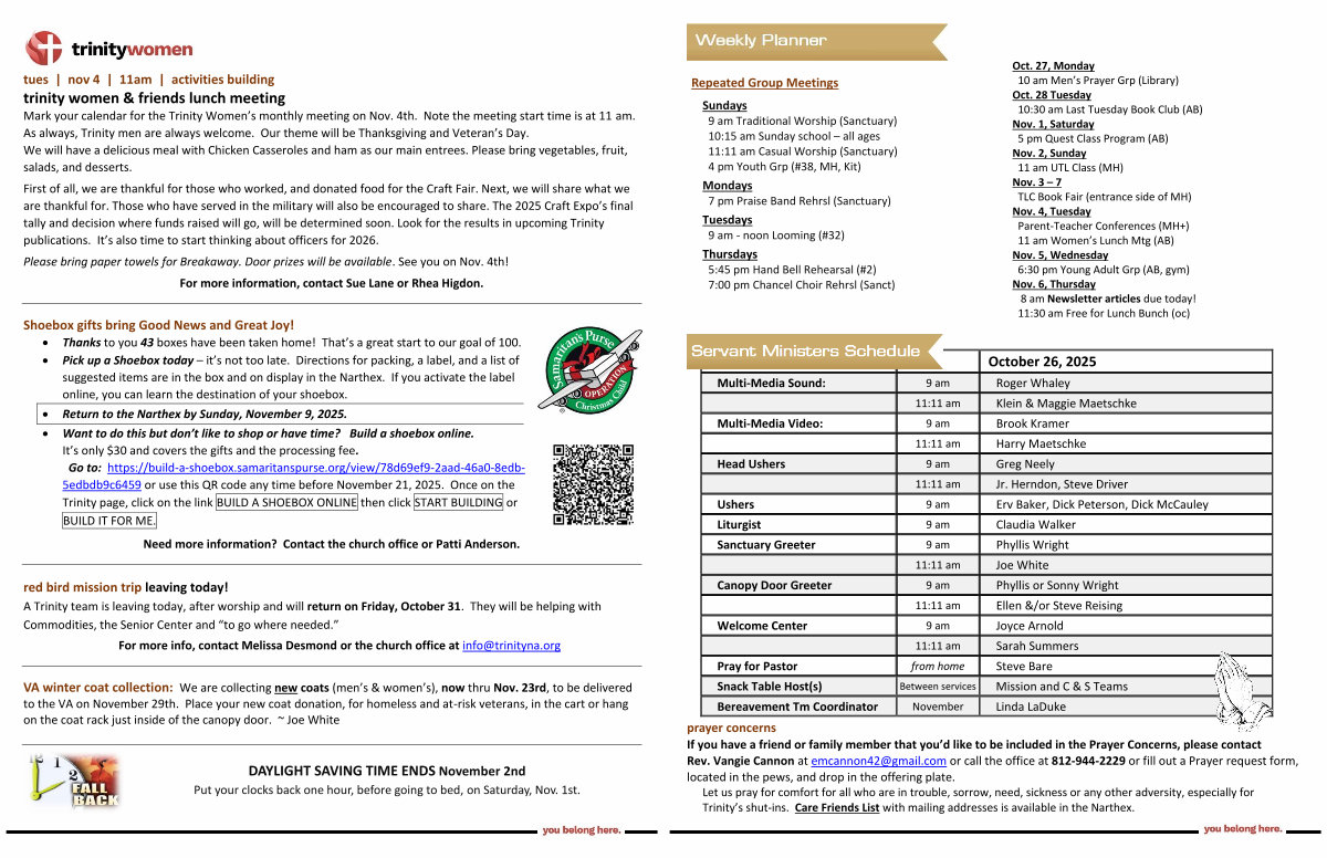 Mark your calendar for the Trinity Women’ s monthly meeting on Nov. 4th. Note the meeting start time is at 11 am. As always, Trinity men are always welcome. Our theme will be Thanksgiving and Veteran’ s Day. We will have a delicious meal with Chicken Casseroles and ham as our main entrees. Please bring vegetables, fruit, salads, and desserts.