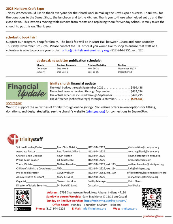 The total budget through September 2025.................. $ 499,438 The actual income received through September.............. $ 439,054 The actual expenses incurred through September............ $ 478,295 The difference( deficit / overage) through September..........($ 39,241) securegive Want to support the ministries of Trinity through online giving? SecureGive offers several options for tithing, donations, and designated gifts; see the church’ s website( trinityna. org) for connections to SecureGive.