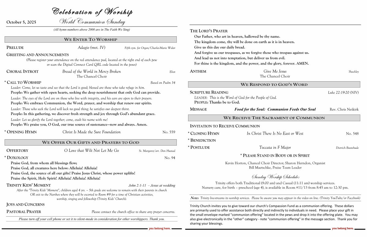 Note: Trinity live-streams its worship services. Please be aware you may appear in the video on line.( Trinity YouTube / or Facebook)