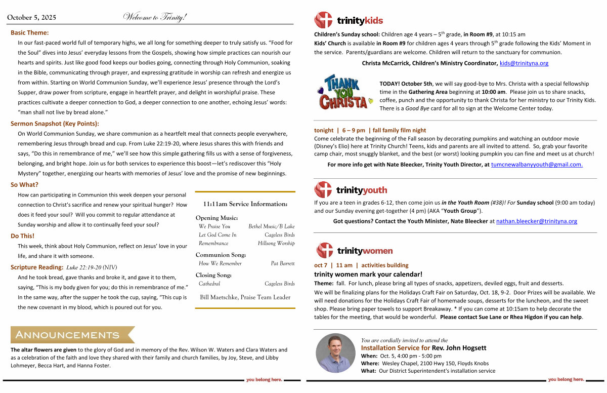 On World Communion Sunday, we share communion as a heartfelt meal that connects people everywhere, remembering Jesus through bread and cup. From Luke 22:19-20, where Jesus shares this with friends and says,“ Do this in remembrance of me,” we’ ll see how this simple gathering fills us with a sense of forgiveness, belonging, and bright hope. Join us for both services to experience this boost— let’ s rediscover this“ Holy Mystery” together, energizing our hearts with memories of Jesus’ love and the promise of new beginnings.