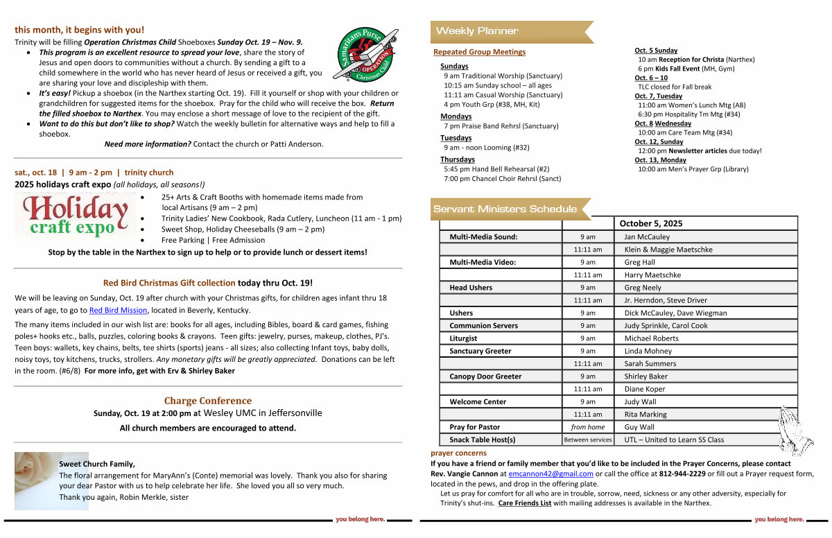 prayer concerns If you have a friend or family member that you’ d like to be included in the Prayer Concerns, please contact Rev. Vangie Cannon at emcannon42 @ gmail. com or call the office at 812-944-2229 or fill out a Prayer request form, located in the pews, and drop in the offering plate. Let us pray for comfort for all who are in trouble, sorrow, need, sickness or any other adversity, especially for Trinity’ s shut-ins. Care Friends List with mailing addresses is available in the Narthex.