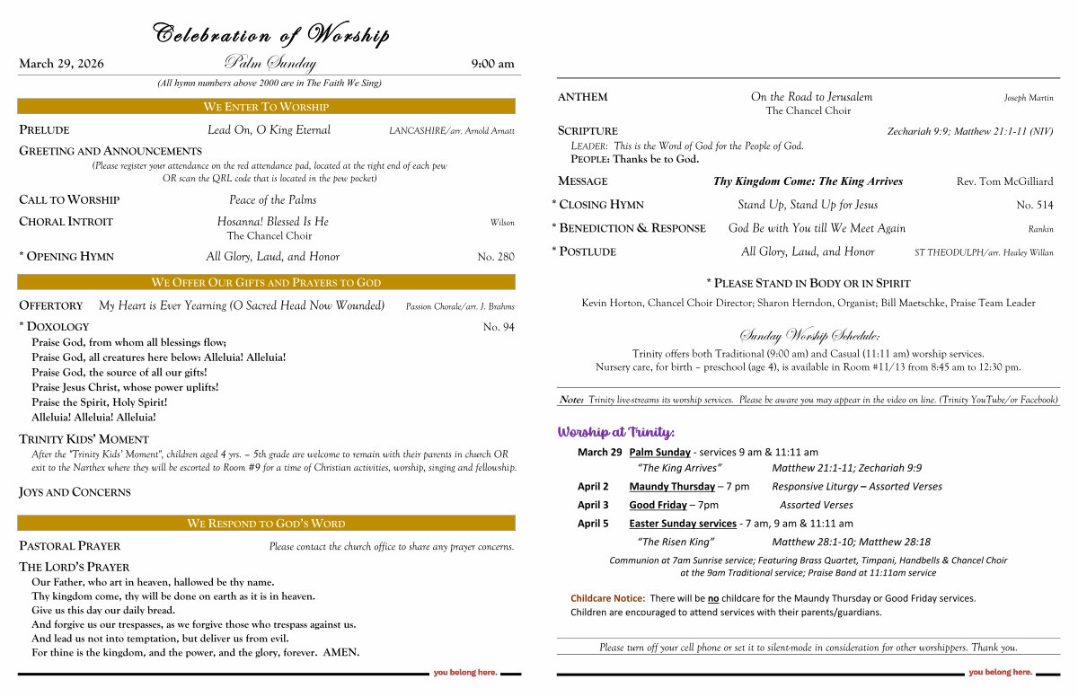 March 29, 2026 Palm Sunday 9:00 am( All hymn numbers above 2000 are in The Faith We Sing)