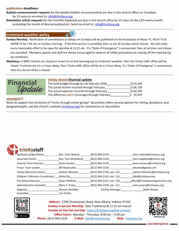 trinity church financial update The total budget through( y-t-d) February 2026 $ 115,630 The actual income received through February $ 136,728 The actual expenses incurred through February $ 120,769 The difference( deficit / overage) through February $ 15,959 securegive © Want to support the ministries of Trinity through online giving? SecureGive offers several options for tithing, donations, and designated gifts; see the church’ s website( trinityna. org) for connections to SecureGive.